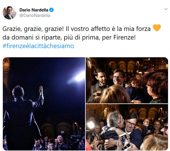 FIRENZE – «Grazie, grazie, grazie. Ha vinto Firenze: noi negli ultimi giorni avevamo qualche sentore positivo ma così larga questa vittoria non ci si immaginava». Lo ha detto il sindaco Dario Nardella questa sera in piazza Signoria dove alcune centinaia di persone si sono radunate per