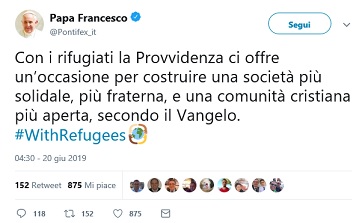 VATICANO – «Con i rifugiati la Provvidenza ci offre un’occasione per costruire una società più solidale, più fraterna, e una comunità cristiana più aperta, secondo il Vangelo». Lo scrive il Papa in un nuovo tweet in occasione della Giornata mondiale dedicata ai rifugiati.