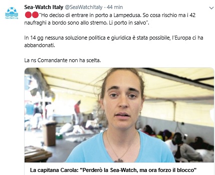LAMPEDUSA – «Ho deciso di entrare in porto a Lampedusa. So cosa rischio ma i 42 naufraghi a bordo sono allo stremo. Li porto in salvo». Così la comandante della Sea Watch, Carola Rackete. In 14 giorni, lamenta la ong, «nessuna soluzione politica e giuridica è stata possibile, l’Europa ci ha abbandonati. La nostra Comandante non ha scelta». in realtà poteva benissimo portarli da qualsiasi altra parte, ma è stato deciso lo scontro con ilGoverno italiano, nonostante le decisioni sfavorevoli alla Ong di numerose Autorità giudiziarie e della Cedu.