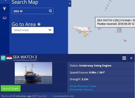 Nell’immagine ripresa dal sito nauticalalmanac.it, alle ore 14,40 si vede nettamente che la nave si è spostata verso Lampedusa e dirige la prua verso l’isola.