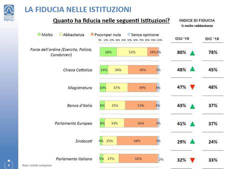 MILANO – Forze dell’ordine e Chiesa cattolica sono le istituzioni verso le quali gli italiani hanno più fiducia. A rivelarlo un’indagine dell’Istituto Piepoli, che sottolinea un incremento del gradimento rispettivamente del 2 e del 3% rispetto alla medesima analisi dello scorso dicembre. Sul podio anche la magistratura, che vede però erodere il consenso, seppure dell’1%. Seguono, in crescita, Banca d’Italia, Parlamento europeo e sindacati. Fanalino di coda il parlamento italiano, che perde un ulteriore 1%.