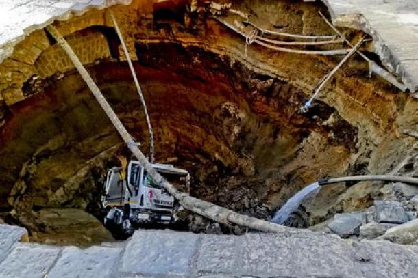 Voragine nel Napoletano: precipita un camion. Autista ferito e ricoverato