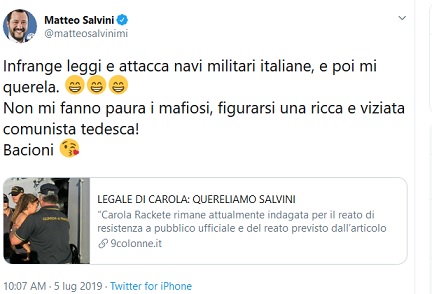 ROMA – Continuano le polemiche a distanza tra la capitana della Sea Watch Carola Rackete e il ministro dell’Interno Matteo Salvini. In un post su Twitter il vicepremier ha annunciato di essere stato querelato dalla capitana: “Infrange leggi e attacca navi militari italiane, e poi mi querela. Non mi fanno paura i mafiosi, figurarsi una ricca e viziata comunista tedesca! Bacioni”.
