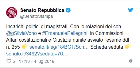 Anche in Senato è iniziata la discussione su un disegno di legge che riguarda, invece, più nello specifico gli incarichi politici dei magistrati con le relazioni dei senatori Gelsomina Vono ed Emanuele Pellegrini. Questi temi saranno, comunque, certamente affrontati anche nella più ampia riforma della Giustizia già annunciata dal ministro Alfonso Bonafede. Nell’attesa della quale le Camere si sono iniziate a muovere.