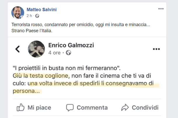 scrive su Facebook il ministro dell’Interno Matteo Salvini, citando il post dell’ex terrorista Enrico Galmozzi