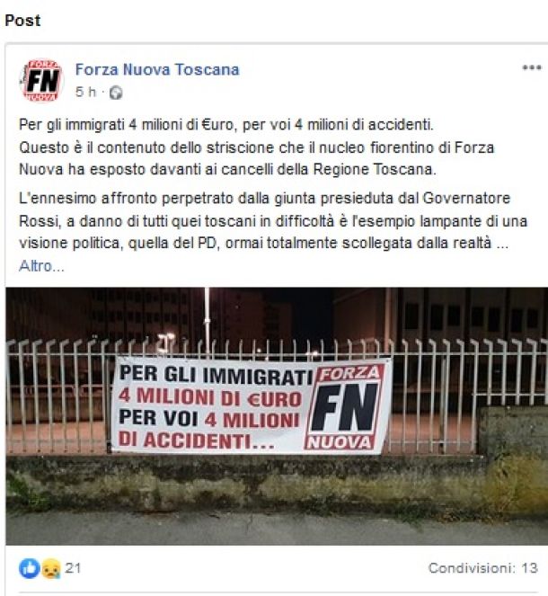 Reagisce con violenza, come suo solito quando si tratta di fascismo, il Governatore: «I fascisti di Forza Nuova hanno esposto i loro vergognosi striscioni davanti alla sede della Regione Toscana,dicendo falsita’ e seminando odio e razzismo, come nel loro costume e nella loro aberrante ideologia. (…) Questi pericolosi fascisti, eredi diretti