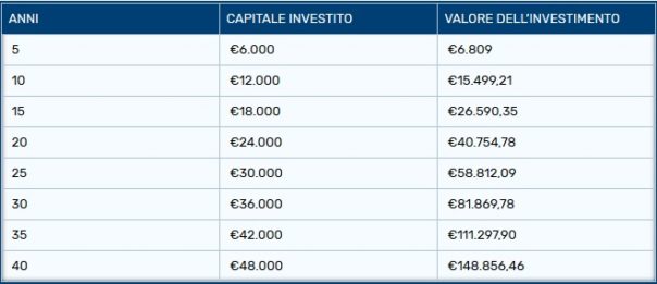 Tanto per dare un’idea di risparmio: agendo per tempo, bastano 100 euro al mese per mettere da parte un buon gruzzolo per la propria pensione. La tabella mostra cosa succederebbe ad esempio investendo €100 al mese per 40 anni, ipotizzando un tasso di crescita annuo del 5% (simulazione di progressione ipotizzata da Fidelity).