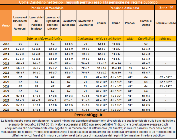 L’ultimo scenario demografico mostra, infatti, un adeguamento nullo per il biennio 2021-2022, una crescita di 3 mesi per ciascuno dei quattro bienni successivi sino al 31 dicembre 2030, un mese nel biennio 2031-2032 e poi due mesi ogni due anni sino al 2054 a cui farebbe seguito un mese di aumento nel biennio 2055-2056. Ciò significa che l’età di vecchiaia resterebbe congelata a 67 anni sino al 31 dicembre 2022 per poi crescere a 67 anni e 3 mesi per gli anni 2023-2024, a 67 anni e 6 mesi tra il 2025 ed il 2026, a 67 anni e 9 mesi tra il 2027 ed il 2028 e raggiungere i 68 anni a partire dal 1° gennaio 2029 e i 70 anni nel 2055. Per gli addetti ai lavori gravosi con almeno 30 anni di contributi che hanno acquisito uno sconto strutturale di cinque mesi sull’età pensionabile (dovuto alla sospensione dell’ultimo adeguamento) resterebbe peraltro confermata l’età pensionabile a 66 anni e 7 mesi sino al 2022. Per quanto riguarda la pensione anticipata con la massima anzianità contributiva (42 anni e 10 mesi di contributi, 41 anni e 10 mesi le donne e 41 anni di contributi per i cd. precoci) e per le “quote” degli addetti ai lavori usuranti occorre ricordare che gli adeguamenti sono stati sospesi per via legislativa sino al 31 dicembre 2026. Eventuali mutamenti dello scenario demografico incideranno quindi per tali prestazioni, salvo ulteriori correttivi normativi, solo a partire dal 1° gennaio 2027.