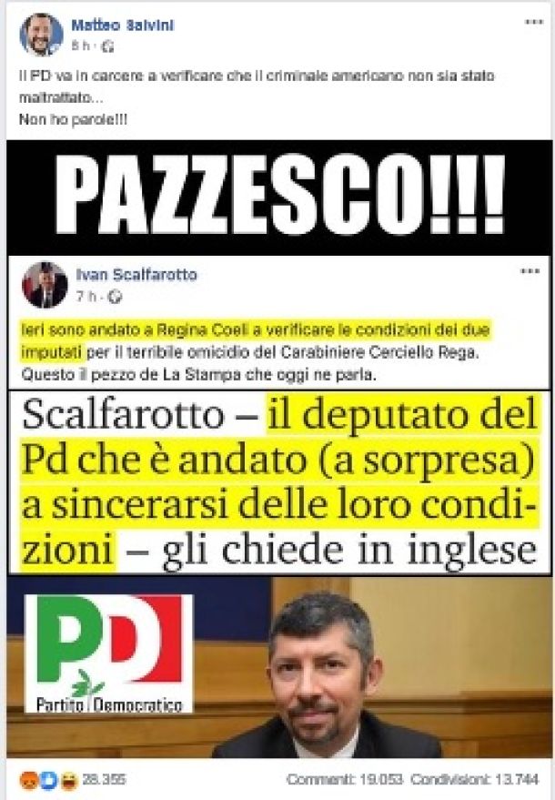 ROMA – «Il Pd va in carcere a verificare che il criminale americano non sia stato maltrattato… Non ho parole!!! Pazzesco». Così Matteo Salvini su Facebook, postando lo screenshot di Ivan Scalfarotto che ha reso noto di essere «andato a Regina Coeli a verificare le condizioni dei due arrestati per l’omicidio del carabiniere Mario Cerciello Rega». Non risulta che Scalfarotto abbia fatto una visita di cnforto e di sostegno alla vedova del carabiniere cerciello, assassinato da uno dei due americani. Ma questo è il Pd.