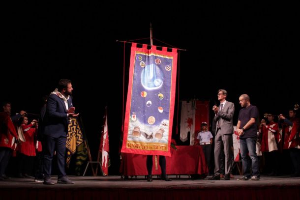 MONTEPULCIANO – Era stata annunciata come un’edizione del Bravìo delle Botti dedicata ai 50 anni dallo sbarco del primo uomo sulla Luna, e la Presentazione del Panno di domenica 18 agosto non ha tradito le aspettative: i contradaioli di Montepulciano sono stati letteralmente stregati dalla luna; allo svelamento dell’opera realizzata dall’artista Stefano Palermo, dedicata proprio a