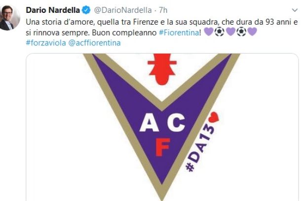 FIRENZE – «Una storia d’amore, quella fra Firenze e lasua squadra, che dura da 93 anni e si rinnova sempre. Buoncompleanno Fiorentina». Lo ha scritto su Twitter il sindaco DarioNardella che ha cosi’ voluto fare i suoi auguri al club gigliato che ha festeggiato ieri il suo compleanno essendo stato fondato il 29 agosto 1926. Nardella ha allegato al suo tweet l’hashtag#forzaviola e la foto del simbolo dello scudetto viola comprensiva delle iniziali che ricordano Davide Astori e il numero 13.