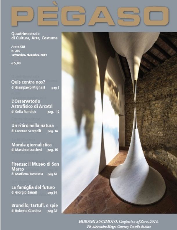 Nel centesimo anniversario dell’impresa fiumana di Gabriele D’Annunzio, la rivista ne illustra la rivoluzione culturale: una fantasia al potere di cui il ’68 non fu che una pallida imitazione. Seguono una visita all’osservatorio astronomico di Arcetri e dal silenzio delle stelle una discesa nel silenzio della natura: due infiniti che si abbracciano… Il quarto potere sempre più potente ha una morale? Lasciamo ogni interrogativo passeggiando nel chiostro e nel