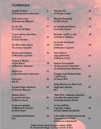 Sempre più importanti gli artisti: una collezione internazionale stupenda al Castello di Ama viene presentata nelle prime pagine. Hiroshi Sugimoto, Daniel Buren, Louise Bourgeois, Michelangelo Pistoletto, Anish Kapoor, RoniHorn, Chiara Bettazzi, Lee Ufan, Chen Zen. Seguono JanfuLyu con il ciclo “The Hedge” e il ciclo “The Traces on Earth”. Poi Alberto Burri con la poetica del nero. L’universo plastico di Mimma Di Stefano. L’arte iraniana di Niousha Rezaeinia. Grandiosi e luminosissimi effetti nei sipari di TuscanyHall: Aldo Mondino, Carla Accardi, Getulio Alviani, Mimmo Paladino, Nicola De Maria, Pino Pinelli, Luigi Mainolfi. Si chiude con le FUCINE: le contaminazioni di Mariaconcetta Giuntini, Daniele Magnani, Alicia Villareal. Armoniose, dolci, musicali le poesie di Cristina Di Maio.