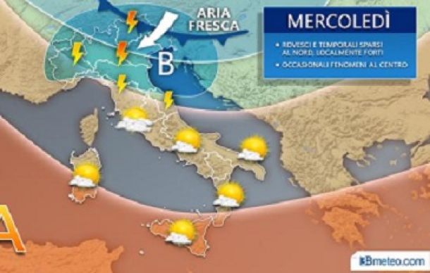 METEO MERCOLEDÌ. Il fronte giunto dal Nord Europa valica le Alpi riversandosi sul Triveneto ed inizia la sua marcia verso sud. Avrà il tempo per estendere i suoi effetti al resto della Val Padana con piogge e temporali fino a Piemonte ed Emilia Romagna, localmente anche di forte intensità e grandinigeni, mentre i fenomeni inizieranno ad esaurirsi sul Triveneto. Peggiora entro sera anche al Centro con rovesci e temporali soprattutto sulle Marche, in misura minore su Toscana, Umbria, Lazio ed Abruzzo. Resiste il bel tempo al Sud. Temperature in calo al Nord e sulle centrali adriatiche, ancora stabili altrove con punte di 30/32°C su interne tirreniche, Tavoliere e zone interne delle isole maggiori.