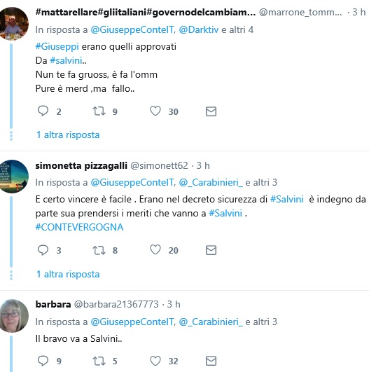 ROMA – «Sbloccati 12mila posti nelle forze dell’ordine. Si tratta di nuove assunzioni per Carabinieri,Polizia, Guardia di Finanza, Vigili del Fuoco e PoliziaPenitenziaria. L’attenzione al settore e la sicurezza deicittadini rimangono una priorita’ per il Governo». Lo scrive suTwitter il presidente del Consiglio, Giuseppe Conte. Ma i commenti successivi sono di scherno per il premier e affermano, il merito è tutto di Salvini, non ti prendere meriti che non hai, eccone alcuni: