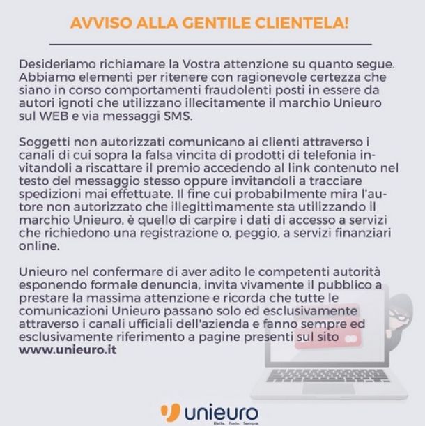 A lanciare l’allarme è la stessa catena di elettronica, che sul proprio account Twitter ha pubblicato un comunicato stampa nel quale avvisa i propri clienti: se ricevete un SMS o un messaggio sul Web che vi comunica che avete vinto uno smartphone, un PC o un qualsiasi oggetto elettronico, invitandovi a tracciare la spedizione, non fidatevi, è una truffa. Unieuro ha già denunciato il fatto e mette in guardia i propri utenti: non fidatevi delle comunicazioni che vi arrivano tramite canali non ufficiali, come gli SMS e i messaggi su WhatsApp.
