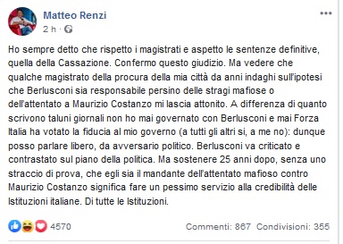 FIRENZE – «Ho sempre detto che rispetto i magistrati e aspetto le sentenze definitive, quella della Cassazione. Confermo questo giudizio. Ma vedere che qualche magistrato della procura della mia città da anni indaghi sull’ipotesi che Berlusconi sia responsabile persino delle stragi mafiose o dell’attentato a Maurizio Costanzo mi lascia attonito. A differenza di quanto scrivono taluni giornali -sottolinea il leader di ‘Italia Viva’- non ho mai governato con Berlusconi e mai Forza Italia ha votato la fiducia al mio governo (a tutti gli altri si, a meno): dunque posso parlare libero, da avversario politico. Berlusconi va criticato e contrastato sul piano della politica. Ma sostenere 25 anni dopo, senza uno straccio di prova, che egli sia il mandante dell’attentato mafioso contro Maurizio Costanzo significa fare un pessimo servizio alla credibilità delle Istituzioni italiane. Di tutte le Istituzioni». Lo scrive su Fb Matteo Renzi