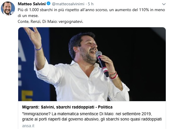 Intanto Matteo Salvini lancia l’allarme per l’incremento del 110% degli sbarchi in un mese.