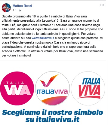 E annuncia: «Sabato prossimo alle 18 in punto il simbolo di Italia Viva sarà ufficialmente presentato alla Leopolda10. Sarà un grande momento di festa. Già, ma quale sarà il simbolo? Facciamo una cosa diversa dagli altri partiti: decidiamo il logo tutti insieme!». Così scrive Matteo Renzi su Fb lanciando un voto on line sul simbolo di Italia Viva.
