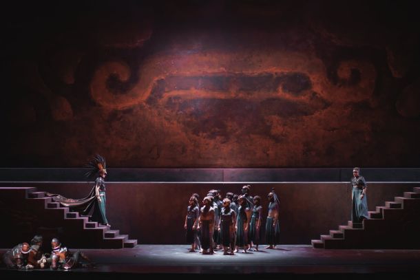 Intelligente la regia di Cecilia Ligorio, che, con l’espediente di estrarre una cornice narrativa dal diario di uno dei conquistatori del Messico (Moralez, personaggio vagamente ispirato a Bernal Díaz del Castillo, autore della «Historia verdadera de la conquista de la Nueva España»), giovane impulsivo e assetato d’oro all’epoca dell’impresa e vecchio ben più riflessivo e un po’ pentito quando scrive il resoconto, proietta l’ombra del dubbio sulla positività dell’eroe. Scene minimaliste, ma a tratti molto suggestive. Nell’insieme, lo spettacolo non manca e, considerati anche l’interesse dell’opera e l’improbabilità di una ripresa, val la pena di profittare di una delle sole tre repliche (mercoledì 16 e mercoledì 23 ottobre alle 19 e domenica 20 ottobre ore 15.30; l’anticipo di orario delle repliche serali è dovuto alla durata: 4 ore e 20 circa, con due intervalli di mezz’ora ciascuno). Dettagli sul sito del Teatro del Maggio