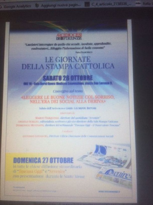 Per approfondire questi aspetti e problematiche, alla vigilia – sabato 26 ottobre alle ore 10 nella sala Borsi dell’Opera Medicea Laurenziana – si terrà un momento di riflessione, che sarà aperto dal saluto del Card. Giuseppe Betori e condotto dal direttore dell’Ufficio delle comunicazioni sociali, Antonio Lovascio. Sul tema “Leggere le buone notizie col sorriso, nell’era dei social alla deriva” interverranno Marco Tarquinio, direttore di Avvenire, ed il nuovo direttore di Toscana Oggi Domenico Mugnaini. Seguirà una testimonianza di Angelo Scelzo, scrittore e già vicedirettore della Sala Stampa Vaticana, sul ruolo avuto dal card. Giovanni Benelli nella nascita e sviluppo del quotidiano cattolico su tutto il territorio nazionale e poi a Firenze nell’ideazione del progetto di “Toscana Oggi” realizzato alla sua morte dal successore card. Silvano Piovanelli.