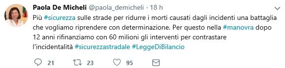 ROMA – Tornano, dopo oltre un decennio, i fondi per il contrasto agli incidenti stradali E’ quanto ha scritto la ministra delle Infrastrutture e dei Trasporti, Paola De Micheli, su Twitter. “Più sicurezza sulle strade per ridurre i morti causati dagli incidenti, una battaglia che vogliamo riprendere con determinazione”, ha sottolineato De Micheli. “Per questo nella manovra, dopo 12 anni, rifinanziamo con 60 milioni gli interventi per contrastare l’incidentalità e la sicurezza stradale”.