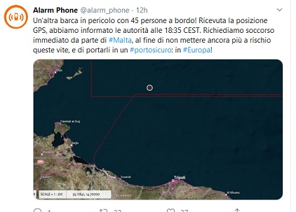 ROMA – L’attivissima ong Alarm Phone, con il suo aereo sempre a caccia di presunti profughi da salvare e da scaricare in Italia, segnala una nuova situazione che definisce potenzialmente tragica: «Un’altra barca in pericolo con 45 persone a bordo! Ricevuta la posizione Gps, abbiamo informato le autorità alle18:35 Cest. Richiediamo soccorso immediato da parte di Malta, al fine di non mettere ancora più a rischio queste vite, e di portarli in un porto sicuro: in Europa». E’ quanto si legge in un tweet sull’account di Alarm Phone. «Ci sono volute quasi 2.5h per riuscire a parlare con Malta! Le persone a bordo sono disperate – si legge in un aggiornamento di AlarmPhone – chiedono aiuto perché sta finendo la benzina, stanno imbarcando acqua ed è buio. Molte persone stanno male, abbiamo anche paura per le donne e i bambini. Non lasciateli annegare».