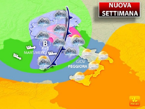I primi segnali si avvertiranno già da lunedì 28 quando ritroveremo una maggior presenza di nubi al Nord soprattutto sull’area alpina e prealpina dove non sono da escludere deboli e brevi piogge. Sul resto del Paese ancora tempo discretamente soleggiato ma soprattutto caldo. Qualche grado in meno invece al Nord (rischio nebbia in pianura).