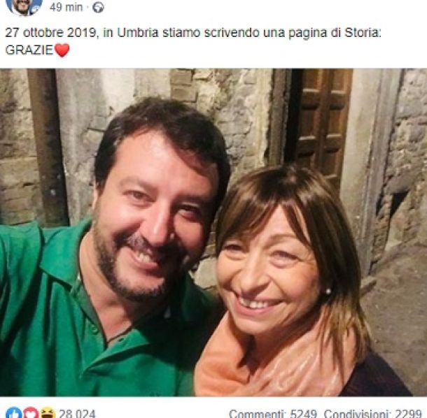 SALVINI – «27 ottobre 2019, in Umbria stiamo scrivendo una pagina di storia: grazie. Cosi’, su Twitter, il leader della Lega Matteo Salvini, commentando i risultati del voto umbro. Messaggio che accompagna una foto che ritrae Salvini assieme alla candidata del centrodestra Daniela Tesei.