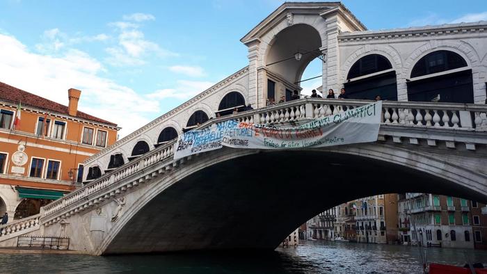 Da Venezia a Matera, basta passerelle elettorali. È lo striscione che alcuni attivisti hanno posizionato sopra il ponte di Rialto, uno dei ponti più famosi di Venezia. «Uniti contro i cambiamenti climatici, è tempo di agire» hanno scritto ancora gli attivisti che fanno riferimento al movimento Fridays for future di Greta Thumberg.