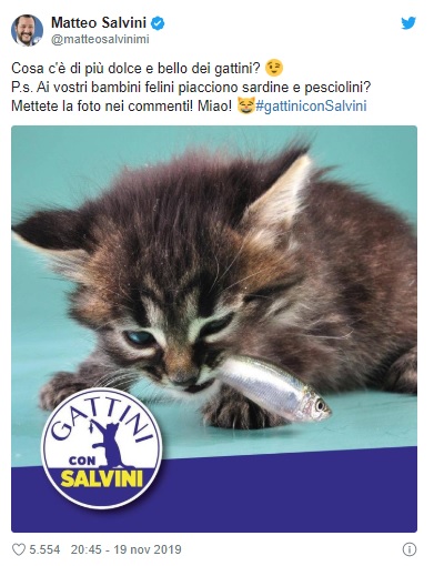Lo scorso 19 novembre, in concomitanza con la nascita del movimento delle cosiddette sardine Salvini ha postato sulle sue pagine social l’immagine di un gatto che si mangia un pesciolino, accompagnata dall’hashtag #gattiniconsalvini.