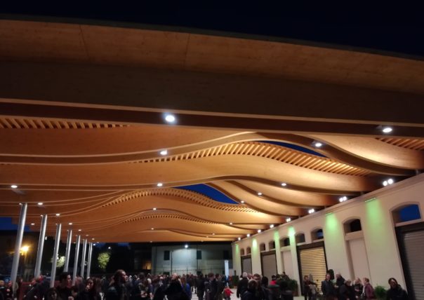 Per la nuova area coperta del mercato, infine, è stata progettata una specifica soluzione a luce led bianca calda per garantire un’adeguata illuminazione sia dal punto di vista funzionale che architettonico: dei 68 punti luce complessivi, 43 sono inseriti fra le travi in legno lamellare della struttura, 18 proiettori sono destinati all’illuminazione architetturale dell’intradosso della copertura in legno, attraverso cui la luce “seguirà” le onde della copertura, e 7 proiettori illuminano la parete di fondo, con la possibilità di attivare luci colorate in occasione di particolari eventi o ricorrenze.