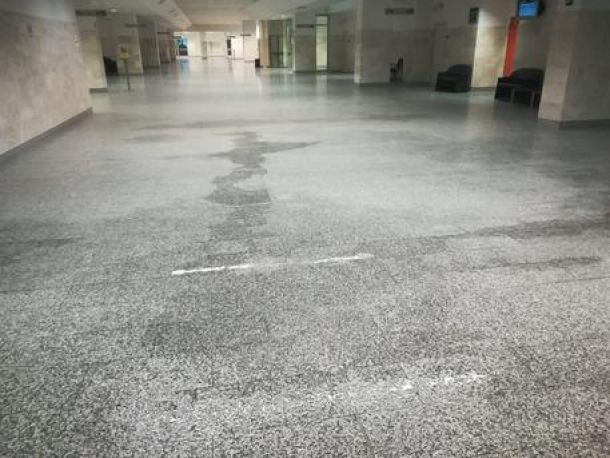FIRENZE – Infiltrazioni di acqua fino al piano seminterrato del Palazzo di Giustizia di Firenze, dove si trovano le aule di giustizia: oggi a causa della forte pioggia si sono formate numerose ‘pozze’ sul pavimento, tanto da costringere il personale a intervenire con un’idropulitrice per rendere il pavimento agibile. L’acqua, che filtra dalle vetrate che ricoprono l’edificio, si accumula poi nel pavimento del corridoio centrale al primo piano, arrivando poi fino al piano seminterrato. Qui, danneggiando i pannelli in cartongesso che ricoprono il soffitto, crea una ‘pioggia’ che si accumula sul pavimento. Per contenere una delle infiltrazioni più copiose questa mattina qualcuno ha sistemato a terra un secchio di vernice vuoto per raccogliere l’acqua.