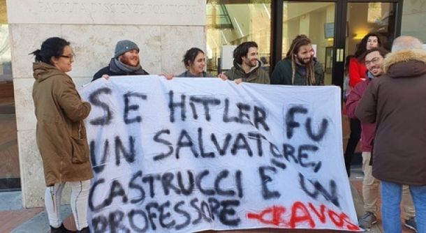 SIENA – «Se Hitler fu un salvatore Castrucci è un professore»: è lo slogan scritto dai giovani del Cravos, l’associazione degli studenti che da questa mattina a Siena, in concomitanza con lo svolgimento del consiglio di dipartimento straordinario dell’università, sta effettuando un sit in davanti alla sede della facoltà di giurisprudenza.