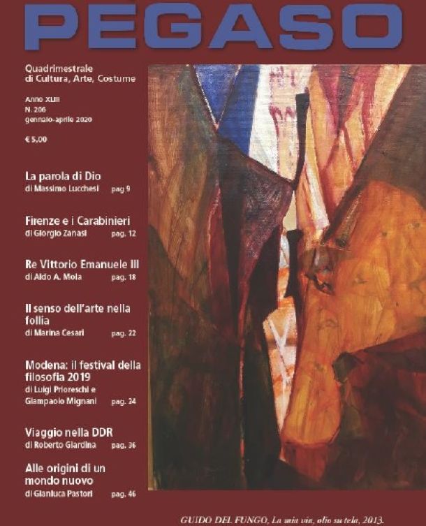 FIRENZE – La parola autentica è mistero, perché ha nell’essere la sua scaturigine. Numero particolarmente profondo, filosofico, metafisico, che guarda all’Oltre questo numero di PEGASO in cui compaiono la Parola, l’ingresso dei Carabinieri (sint ut sunt aut non sint) a Firenze 160 anni fa, la nascita del giornale La Nazione, il festival della filosofia di Modena, il lungo regno di Vittorio Emanuele III, ricordato nel 150° della nascita. Continuiamo sottovoce a leggere con rispettosa lentezza gli articoli che seguono: la Germania Est prima della caduta del muro, utilità della letteratura, il mondo nuovo nato dalla seconda guerra mondiale, gli accademici de La Pergola Arte.