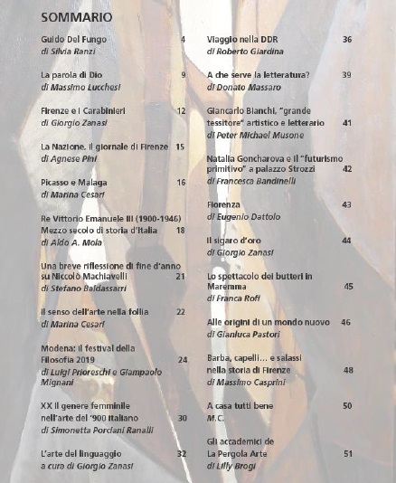 Importanti gli articoli di arte. Guido Del Fungo a cui viene dedicata la copertina, Picasso a Malaga, l’arte nella follia, il genere femminile nell’arte del ‘900 italiano, Natalia Goncharova e il futurismo primitivo a palazzo Strozzi.