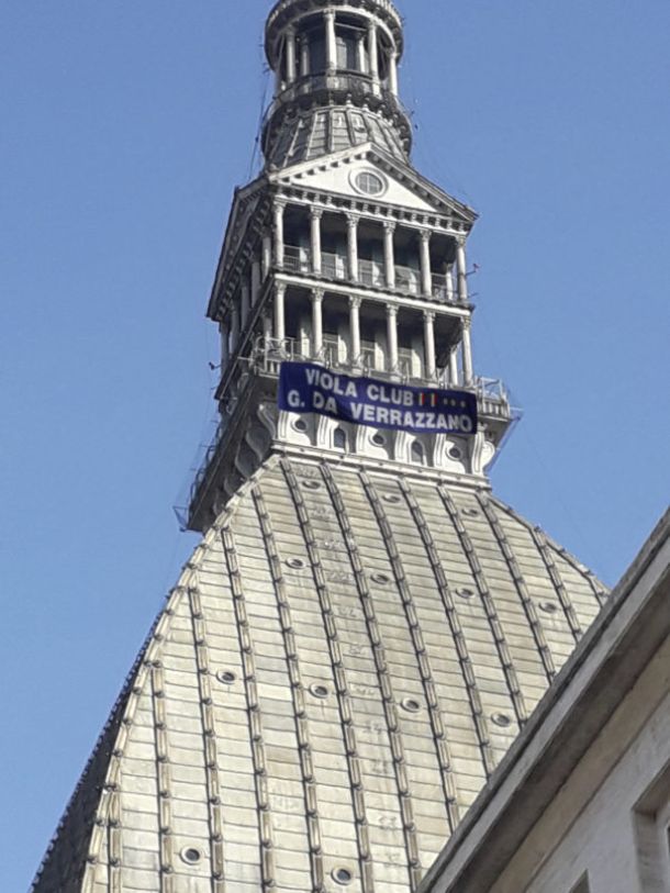 Fiorentina: lo striscione del Viola club Da Verrazzano sulla Mole Antonelliana di Torino