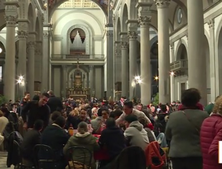 FIRENZE – Seicento persone, tra commensali e volontari, hanno partecipato oggi al pranzo di Natale per i poveri organizzato nella basilica di San Lorenzo a Firenze dalla Comunità di Sant’Egidio. Ad aiutare nella preparazione, nell’allestimento e nel servizio ai tavoli, più di cento volontari. Una mensa allargata per rilanciare la volontà di stare insieme perché nessuno deve restare solo. All’appuntamento annuale della Comunità per i senza dimora, gli anziani soli, le famiglie in difficoltà, le persone fragili. Fra di loro, oltre al Cardinale Arcivescovo Giuseppe Betori, anche il sindaco Dario Nardella e il presidente del consiglio regionale Eugenio Giani.