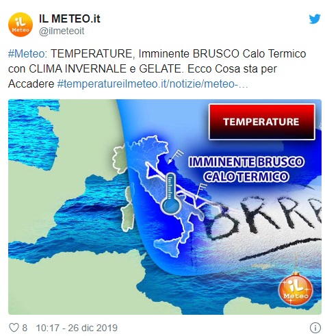 Il team del sito www.iLMeteo.it comunica che le temperature subiranno un’importante abbassamento, soprattutto al Centro-Sud con valori che andranno sotto la media di 5-6°C. I valori termici al Nord si manterranno molto bassi di notte con estese gelate, qualche grado sopra lo zero di giorno. Al Centro-Sud di giorno non si supereranno i 6-8°C mentre di notte si scenderà fino a qualche grado sopra lo zero.