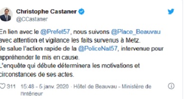 Su twitter il ministro dell’interno Cristophe Castaner si felicita con la Polizia per il tempestivo ed efficace intervento e conferma che il ministero segue la situazione.