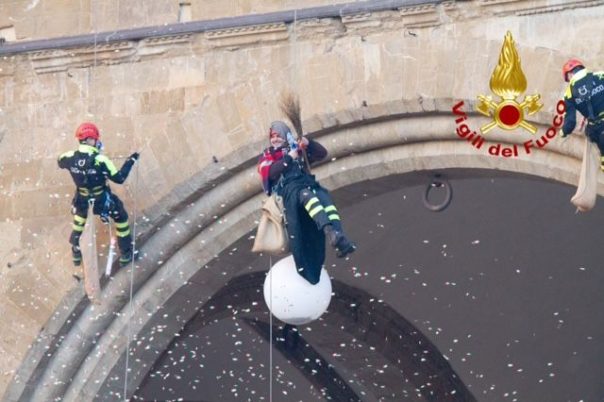 Nel pomeriggio intorno alle ore 15.45 un numero importante di persone si è raggruppato davanti alla Loggia dei Lanzi in Pizza della signoria, per veder scendere la Befana della Loggia dei Lanzi. L’evento organizzato dalla Galleria degli Uffizi, con la partecipazione dei Vigili del Fuoco di Firenze, il Patrocinio del Comune, è giunto alla sua quarta edizione e vede accrescere ogni anno il numero di curiosi che attirati da questo momento magico, si soffermano a guardare la calata della anziana signora, che con l’aiuto di 5 Vigili del Fuoco assicura l’importante sacco a terra. Ogni anno qualche piccola novità questa edizione ha visto come protagonisti i bambini che hanno teso un telo per raccogliere quante più caramelle possibili che “cadevano dal sacco della Befana “distratta”; ad aiutare la discesa della anziana signora tre pompieri che hanno cosparso l’aria antistante la Loggia di coriandoli e caramelle riempiendo l’area intorno alla Loggia dei Lanzi di colore ed atmosfera.