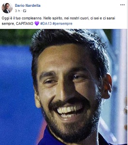 «Oggi è il tuo compleanno. Nello spirito, nei nostri cuori, ci sei e ci sarai sempre, Capitano». Lo ha scritto, sul proprio profilo facebook, il sindaco di Firenze Dario Nardella che ha voluto così ricordare Davide Astori, capitano della Fiorentina scomparso il 4 marzo 2018: Astori oggi avrebbe compiuto 33 anni.