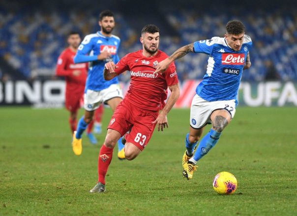 VAR – Viola in maglia rossa, in omaggio al quartiere di Santa Maria Novell, vinitore del torneo del Calcio storico 2019. Ritorna Chiesa, in tandem con Cutrone. Per il resto formazione confermata dopo la vittoria sull’Atalanta in Coppa Italia, se si esclude la presenza in porta di Dragowski dopo l bella parentesi che ha saputo ritagliarsi Terracciano. In panchina si rivede Maxi Olivera. Molte assenze nel Napoli, ma Gattuso schiera comunque una formazione di tutto rispetto. Fiorentina subito pericolosa al secondo minuto. Azione Cutrone-Chiesa e calcio d’angolo. Batte Pulgar, svetta di testa Milenkovic, ma il tocco è centrale. Facile per Ospina. Ancora Fiorentina al 9’_ Milenkovic supera Insigne, serve Lirola che crossa bene per Castrovilli che, davanti, a Ospina,colpisce di ginocchio e la mette fuori. Replica il Napoli: rasoiata di Callejon per Milik (12′) che non controlla a centro area e la scaraventa lontano dalla porta di Dragowski. Che dire fino a questo moento? La Fiorentina è compatta e ben messa in campo, fa ragnatela e riparte puntualmente. Ma davanti non risulta ficcante come dovrebbe. Almeno finora. Al 18′ gioco fermo per presunto fallo di mano di Allan in area. Var in azione. Passano lunghi istanti, poi Pasqua va a vedere l’azione e decide che non è rigore. Scelta giusta, a parer mio: il tocco di Allan è apparso del tutto fortuito e non rilevante ai fini dell’azione. Quindi, al 23′, Caceres è provvidenziale nell’anticipo di Callejon solo davanti a Dragowski.