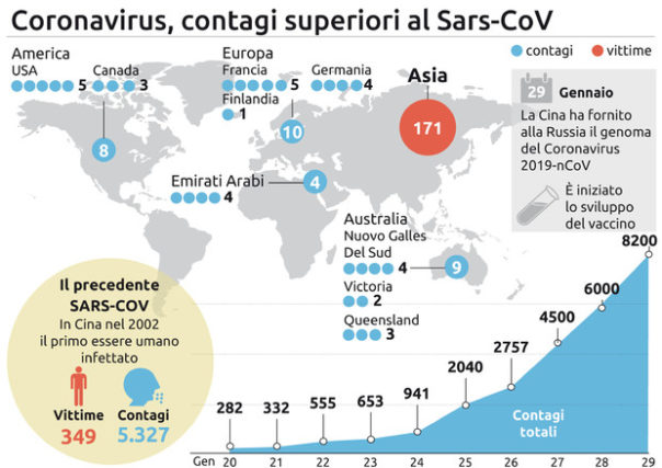 Intanto, per l’Organizzazione mondiale della sanità è emergenza globale per il Coronavirus. «La Cina – detto il direttore generale dell’Oms Tedros Adhanom Ghebreyesus – ha preso straordinarie misure per fare fronte all’emergenza del virus 2019-nCoV, ha isolato il virus, lo ha seqenziato e ha condiviso i dati con tutti. Dobbiamo ringraziare tutti coloro che hanno lavorato ininterrottamente per tutto questo tempo». Per l’Oms, però, non è possibile immaginare quanto grande sara’ questa emergenza e quindi bisogna essere preparati ad affrontarla. Da qui la decisione di dichiarare l’emergenza internazionale. Risalgono a metà dicembre i primi casi di trasmissione da uomo a uomo del coronavirus 2019-nCoV e sono quindi precedenti perfino alla notifica dei primi casi dell’infezione. Dopo una prima fase di cautela, l’Oms ha certificato che il livello di attenzione massima ha oltrepassato i confini cinesi. Nel paese i numeri continuano a correre: i contagi sono oltre 8.100, le vittime 170. La Cina è sempre più isolata, dopo che la Russia che ha chiuso il confine orientale e alcune compagnie aeree internazionali hanno interrotto i collegamenti. In Cina l’infezione è arrivata ovunque, toccando anche il Tibet. La maggior parte dei contagi resta concentrata nella provincia epicentro di Hubei ed quasi 1.400 persone sono gravi. Sui loro profili ci sono ancora scarse informazioni. La rivista scientifica The Lancet, analizzando 99 ricoveri a Wuhan, ha rilevato che la quasi totalità sarebbe scaturita dalle esposizioni al pesce ed agli animali selvatici del mercato di Wuhan, mentre i primi casi di contagio uomo a uomo sono arrivati diversi giorni prima. La malattia sembra aggredire soprattutto anziani maschi con problemi medici precedenti. Gli esperti cinesi osservano che con adeguate misure di contenimento e prevenzione i contagi potrebbero calare, ma la priorità è trovare un vaccino: secondo i ricercatori cinesi, serviranno almeno 3 mesi. Un laboratorio in California ha previsto i primi test tra giugno e luglio. Al lavoro anche russi e australiani.