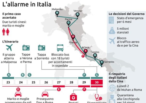 Resta, comunque, l’allarme dopo la verifica dei due casi certificati: una coppia di turisti cinesi provenienti da Wuhan, che erano atterrati a Milano il 23 gennaio prima di arrivare 4 giorni fa in un hotel della Capitale. La coppia è ora ricoverata allo Spallanzani. I cinesi hanno fatto tappa a Milano, Verona, Parma, Firenze fino naturalmente a Roma, dove si sono manifestati i sintomi della malattia