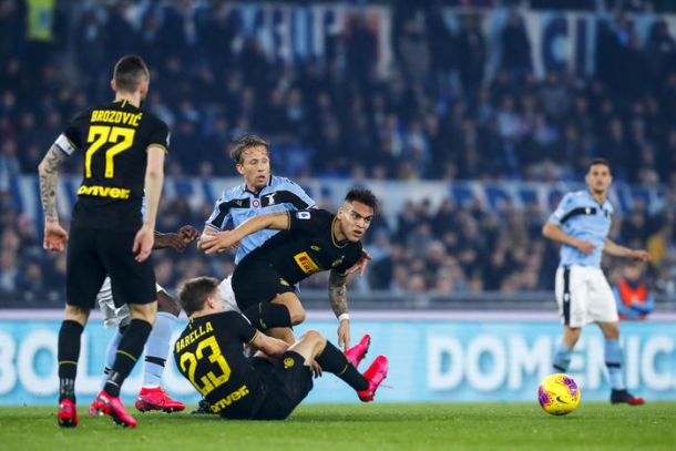 La prima occasione dell’incontro è di marca nerazzurra: su corner di Candreva Godin svetta di testa ma non trova la porta. All’8′ improvvisa giocata di Milinkovic-Savic che di destro lascia partire dal limite un tracciante che si stampa sulla traversa. Sponda di Lukaku per l’accorrente Candreva che entra in area e scarica al centro ma la difesa biancoceleste spazza. Partita molto tattica e in sostanziale equilibrio tra le due squadre che vantano le migliori difese della Serie A. Al 19′ contropiede dell’Inter orchestrato da Brozovic che vede Lukaku, il tiro dell’attaccante belga viene respintoda Strakosha in angolo. Quattro minuti più tardi Immobile lavora un pallone in area e lascia aLeiva che spara alto. Ancora Immobile, dal limite il bomber biancoceleste un po’ sbilanciato calcia sopra la traversa. Al 29′ contropiede nerazzurro con Lukaku che serve Candreva, il tiro viene murato da un difensore. Al 44′ potente destro dai 25 metri di Candrevarespinto da Strakosha, sulla ribattuta Ashley Young si coordina e di destro insacca, per l’ex Manchester United si tratta del primo gol in Italia. A inizio ripresa, minuto 50′, rigore per la Lazio: su un pallone alzato da un difensore nerazzurro De Vrij commette fallo su Immobile, l’arbitro Rocchi non ha esitazioni a indicare il dischetto. Dagli 11 metri si presenta Immobile che spiazza Padelli per l’1-1. La reazione della squadra di Conte è una punizione di Lukaku alta. Al 57′ Lautaro per Lukaku che entra in area, il tiro viene deviato in angolo in scivolata da Acerbi.