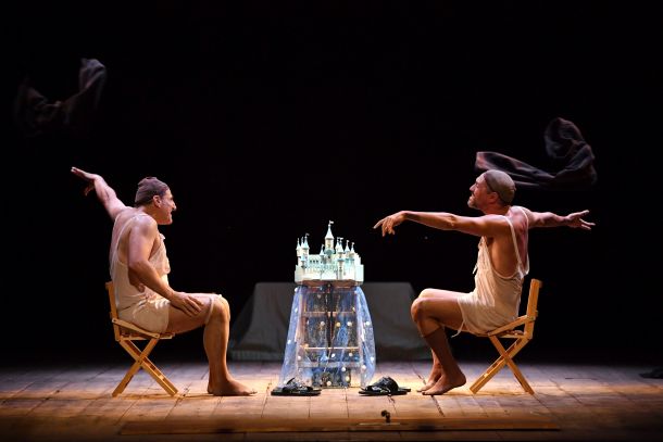 Nell’adattamento di Emma Dante le due vecchie sorelle decrepite e brutte, Carolina e Rusinella, sono interpretate da Salvatore D’Onofrio e Carmine Maringola (marito di Emma Dante), una coppia di maschi vigorosi e sudati cui sono affidati ruoli femminili come nella tradizione del teatro settecentesco. Usando degli elementi minimalisti ed essenziali, in un palcoscenico praticamente vuoto, due seggiulelle per fare il vascio, una porta per fare entra ed esci dalla catapecchia e un castello in miniatura per evocare il regno, i due uomini mettono in gioco tutta la loro prorompente fisicità per dare vita a un racconto da sogno, drammatizzando la fiaba con umorismo e volgarità. Sembra che il re intenda sposare la più bella del reame e che loro, seppur rattrappite e grinzose e iscritte al libro mastro della bruttezza, abbiano qualche possibilità di successo. La fantasia prende facilmente il volo e le anziane artritiche acquistano improvvisamente agilità per rappresentare i vari personaggi che si affacciano alla loro mente esaltata. Basta un cencio in testa per diventare un re, un lenzuolo si trasforma nel manto di una fata, una parrucca rossa e due lunghi guanti bianchi ed ecco che la sorella più giovane sembra l’atomica Rita Hayworth…