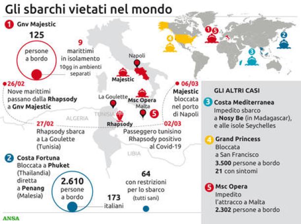 Paura rientrata invece a Napoli dove un’altra motonave, la Majestic della compagnia Gnv, con a bordo 125 persone tra equipaggio e operai, è da un paio di giorni ancorata nel porto del capoluogo partenopeo. A bordo ci sono nove marinai entrati in contatto con un collega tunisino risultato positivo al virus nel corso di un viaggio tra Genova e Tunisi. Le autorità sanitarie li hanno sottoposti a controlli escludendo la presenza di sintomi da Covid 19. Sono stati tuttavia sottoposti in via precauzionale a isolamento per i prossimi dieci giorni.Via libera degli uffici sanitari, invece, per gli oltre cento componenti dell’equipaggio che potranno lasciare la nave. I nove membri dell’equipaggio della Gnv Majestic stanno bene, non hanno sintomi, sono solo in isolamento precauzionale, afferma Antonio Salzano, capo dell’ufficio Sanità Marittima di Napoli. Non hanno sintomi e al momento non gli abbiamo fatto il tampone. Li abbiamo messi in isolamento per precauzione. Per la nave – si precisa dalla compagnia armatrice, la Gnv con sede a Genova – la sosta a Napoli era già prevista per consentire ordinari lavori di manutenzione. Motivo per cui non si può parlare tecnicamente di blocco.