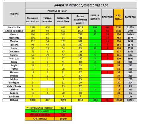 Dall’inizio dell’epidemia di Coronavirus, 10.149 persone hanno contratto il virus Sars-CoV-2, 529 in più rispetto a lunedì. Di queste, 631 sono decedute (+ 168) e 1.004 sono guarite. Attualmente i soggetti positivi sono 8.514 (il conto sale a 10.149 — come detto sopra — se nel computo ci sono anche i morti e i guariti): 619 in più rispetto a ieri.