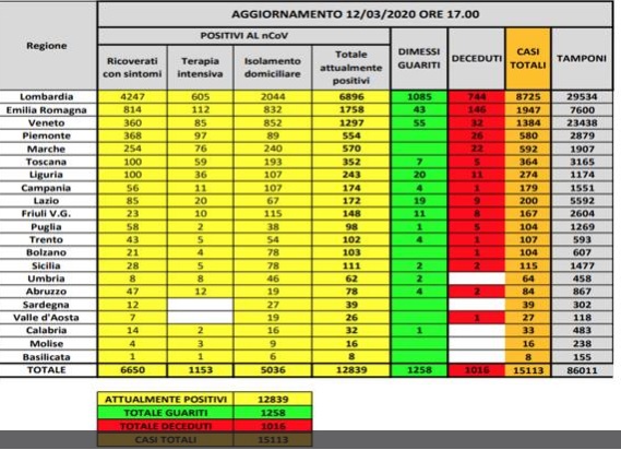 Stando al bollettino della Protezione Civile, sono 6.896 i malati in Lombardia, 1.947 in Emilia Romagna, 1297 in Veneto, 554 in Piemonte, 570 nelle Marche, 352 in Toscana, 172 nel Lazio, 174 in Campania, 243 in Liguria, 148 in Friuli Venezia Giulia, 111 in Sicilia, 98 in Puglia, 205 in Trentino Alto Adige, 78 in Abruzzo, 62 in Umbria, 16 in Molise, 39 in Sardegna, 26 in Valle d’Aosta, 32 in Calabria, 8 in Basilicata.